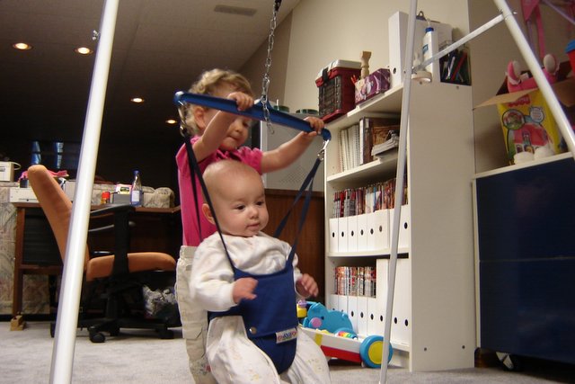 Max is finally into his jolly jumper. Indy loves to help Max with his 'jumping' and 'turning around'. Mom just hopes Max does not develop motion sickness.